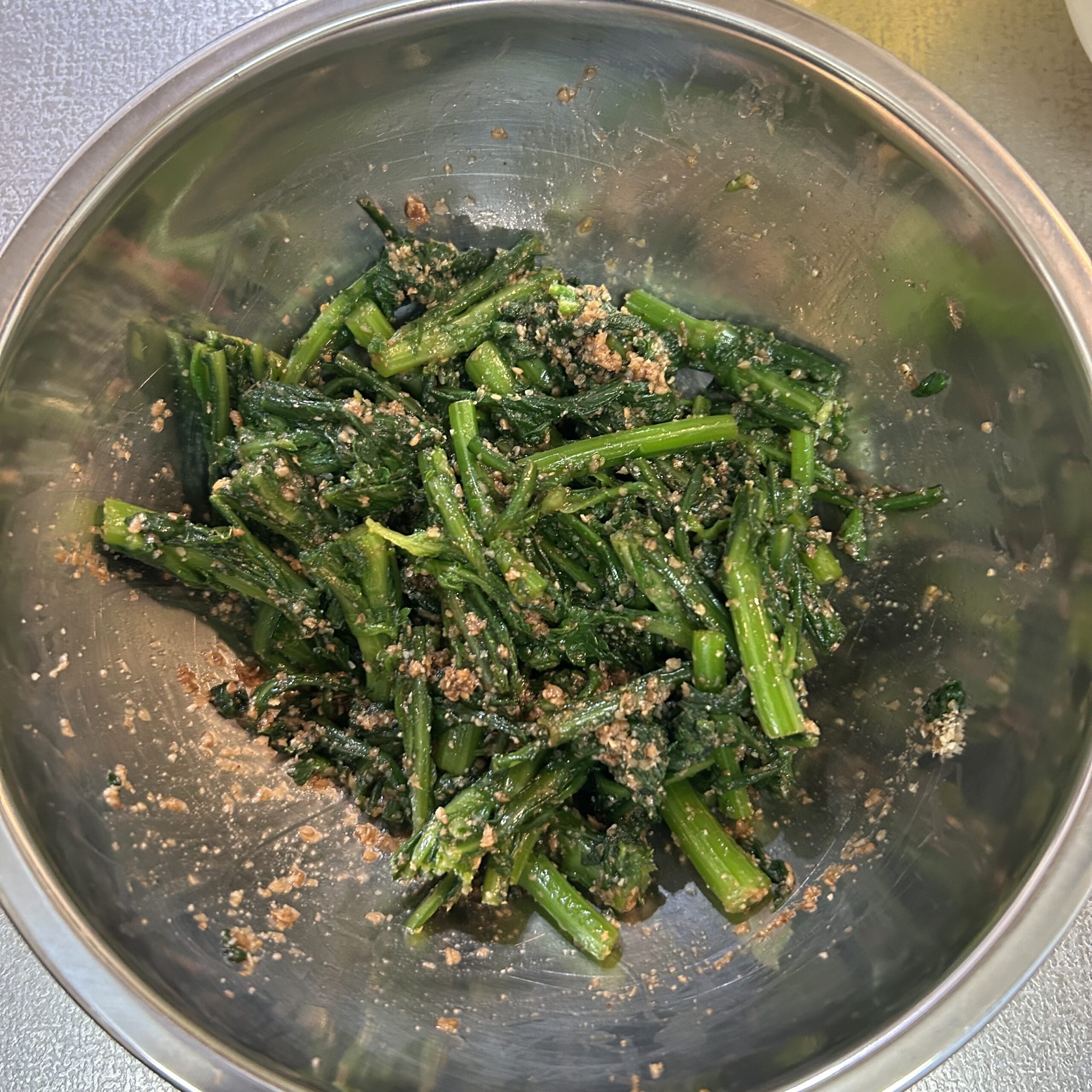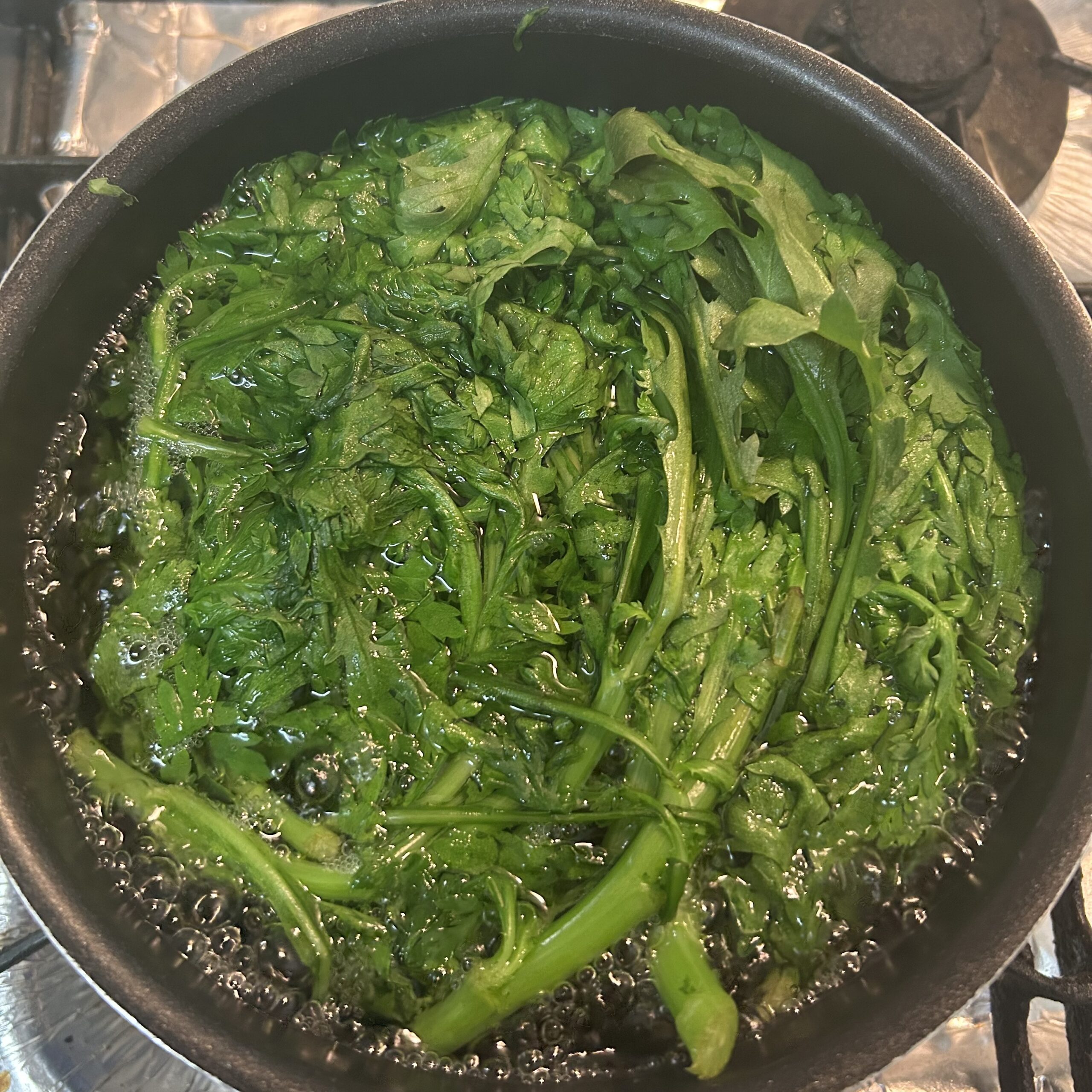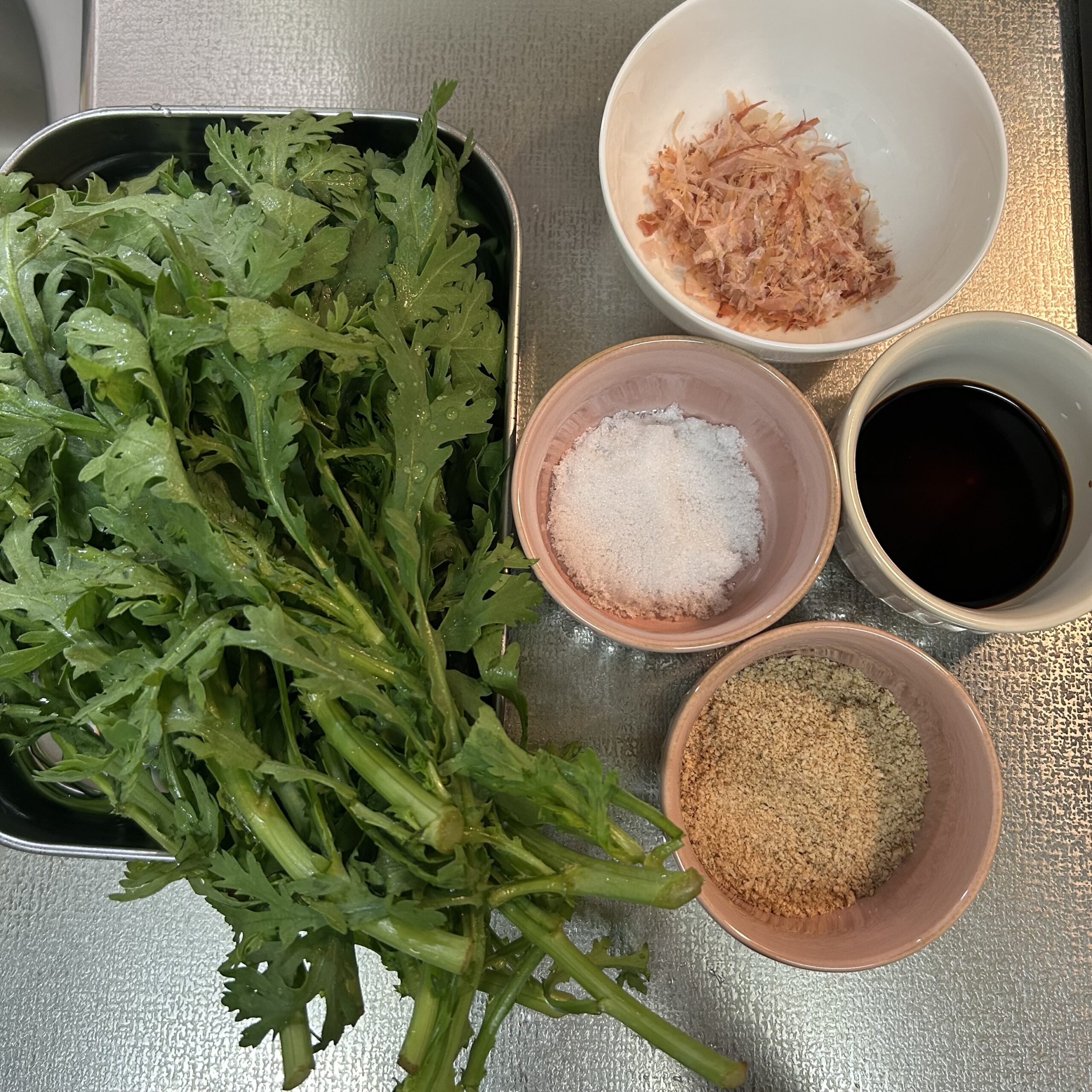 1.春菊を洗い、鍋にたっぷりの湯を沸かし、塩を加える。春菊の茎を浸して15秒ほど茹でたら葉も湯に入れ、再沸騰するまで茹でる。