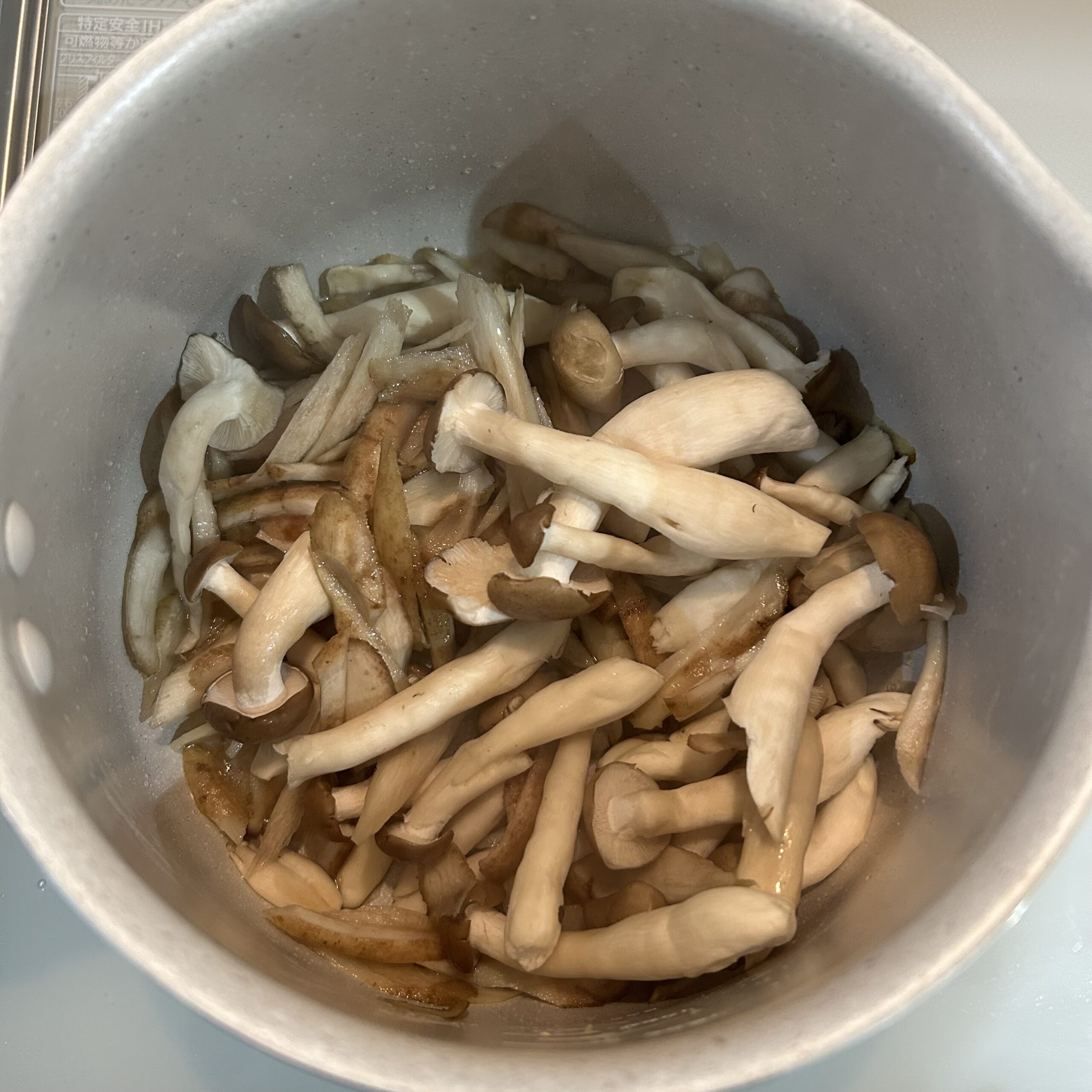 2.鍋にごま油を入れて中火で熱し、ごぼうとしめじを入れて炒める。