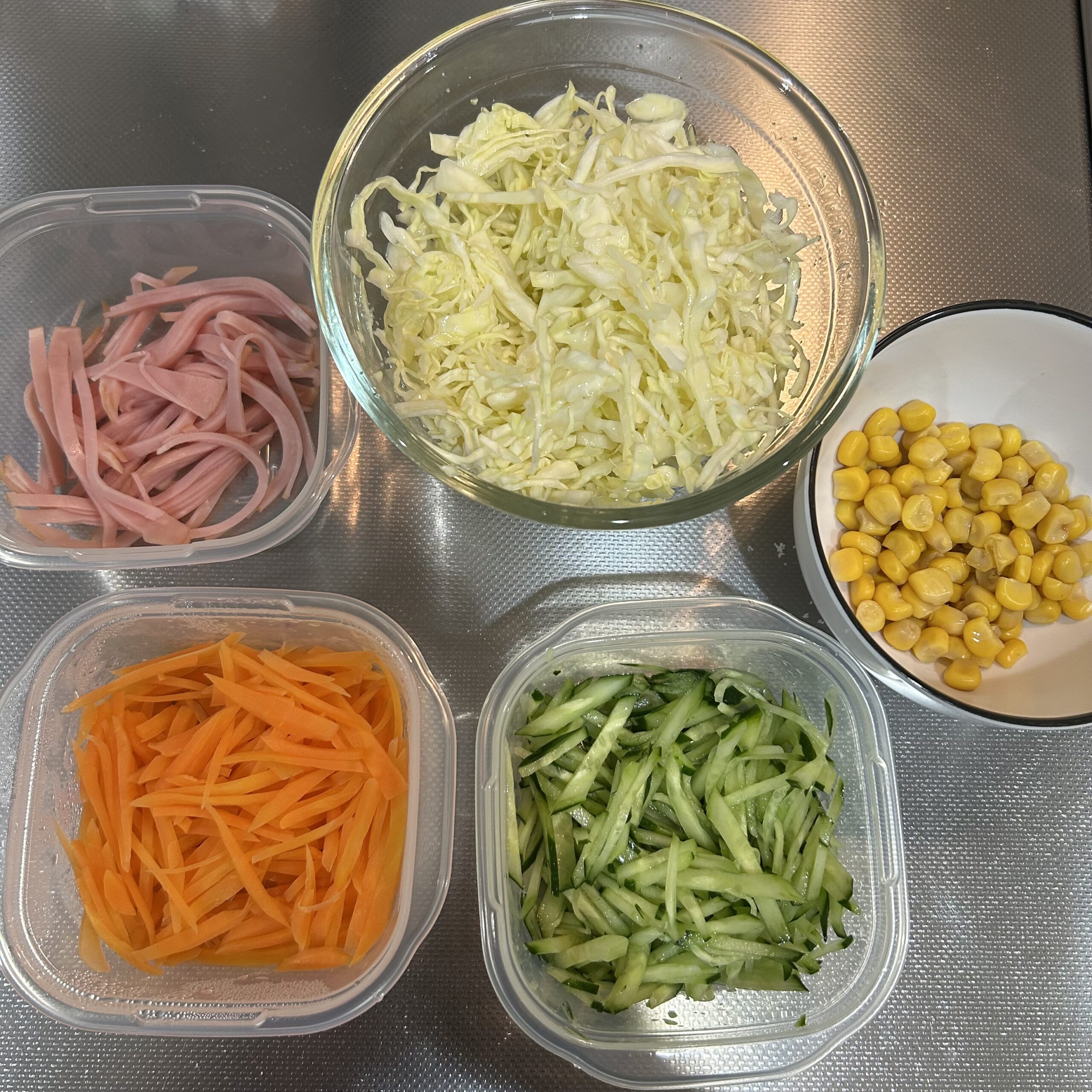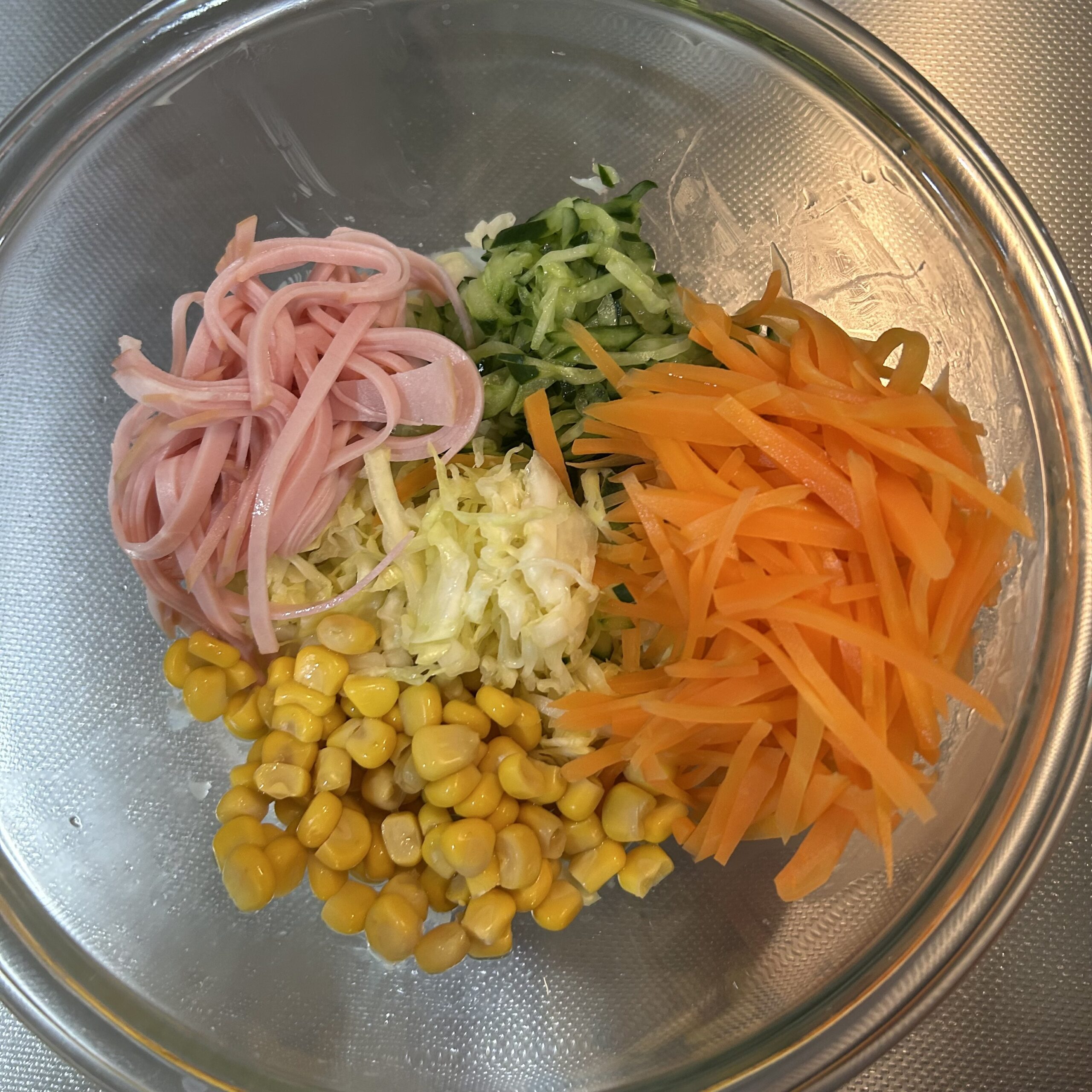 1.春キャベツは硬い芯を取り除き、細切りにする。きゅうりは皮をむいて細切りにする。